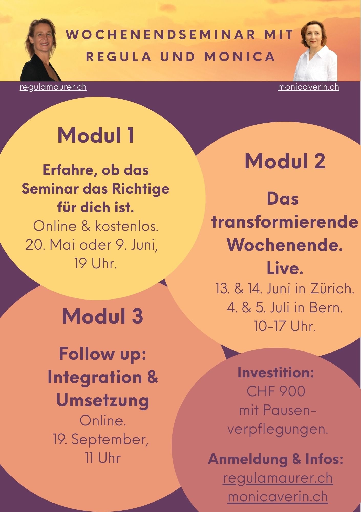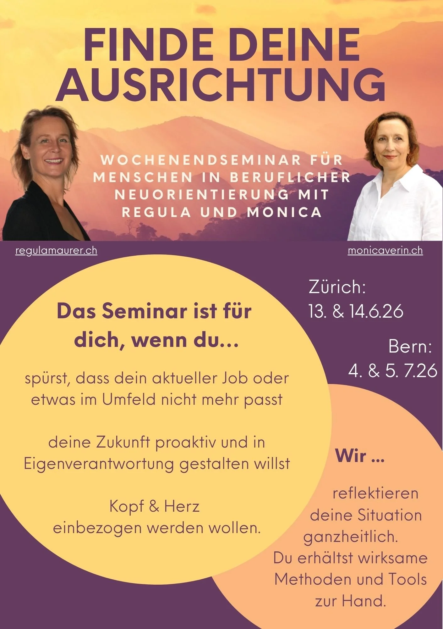 Wochenendseminar für berufliche Neuorientierung mit Monica Verin und Regula Maurer. *** Standortbestimmung, Coaching, Klarheit und konkrete nächste Schritte in Zürich und Bern. ***